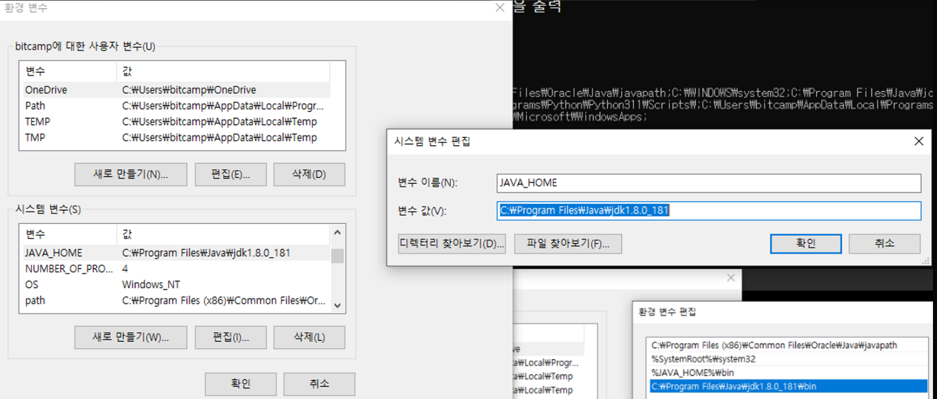 c:\programfiles\Java\JDK1.8.0 경로를 JAVA_HOME으로 지정해주고 echo %java_home%로 출력하고 싶을 때. '시스템 변수'에서 바로 새로만들기 'JAVA_HOME'을 만들어준다.